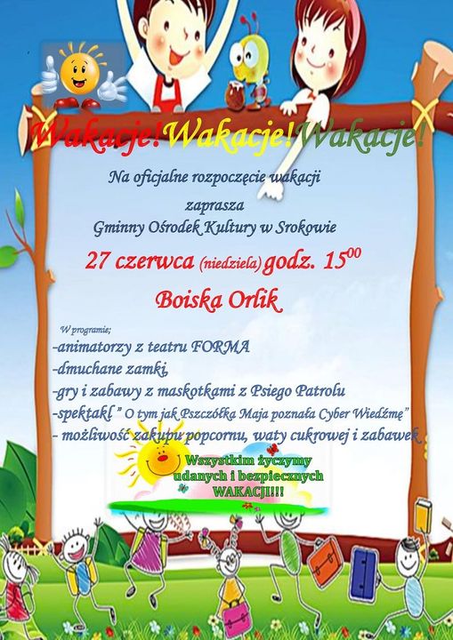 27 czerwca o godzinie 15:00 na Boisku Orlik w Srokowie rozpocznie się oficjalne rozpoczęcie wakacji w gminie Srokowo organizowane przez Gminny Ośrodek Kultury w Srokowie.