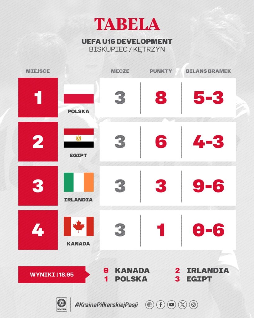 Zakończył się emocjonujący turniej UEFA Development U16, który w tym roku gościł w Kętrzynie i Biskupcu. Młodzi reprezentanci Polski okazali się najlepsi w czterozespołowej stawce, rywalizując z drużynami Irlandii, Egiptu i Kanady.