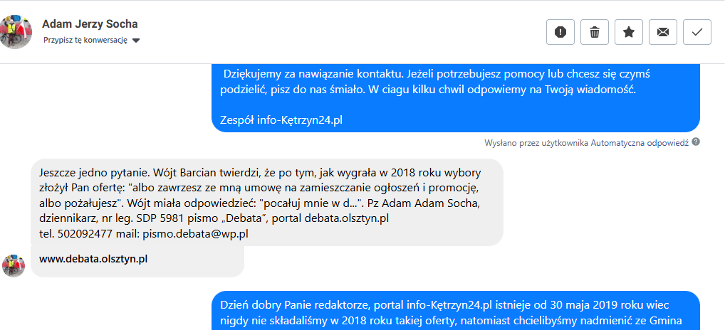 Cała ta konstrukcja rozpada się jednak natychmiast po zderzeniu z faktami. Po pierwsze – w wersji wójta miało to rzekomo wydarzyć się w 2018 roku, choć info-Kętrzyn24.pl powstało dopiero 30 maja 2019 roku. Gdy zwróciliśmy redaktorowi Debaty uwagę na tę oczywistą sprzeczność, w kolejnej wiadomości bardzo szybko „skorygował” datę, przenosząc historię na rok 2024. Nikt nie wyjaśnił, dlaczego wójt miała wskazać rok, w którym nasza redakcja nie istniała, ani dlaczego redaktor Socha natychmiast dopasował nową wersję wydarzeń, zamiast zweryfikować źródło informacji. Również redaktor Socha nie odpowiedział na jedno fundamentalne pytanie: skąd wziął tę opowieść i dlaczego zdecydował się powielać niesprawdzone tezy dotyczące naszej redakcji?